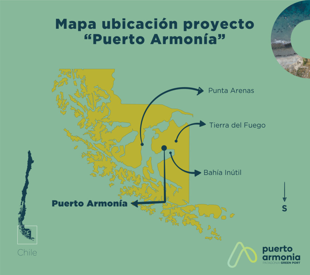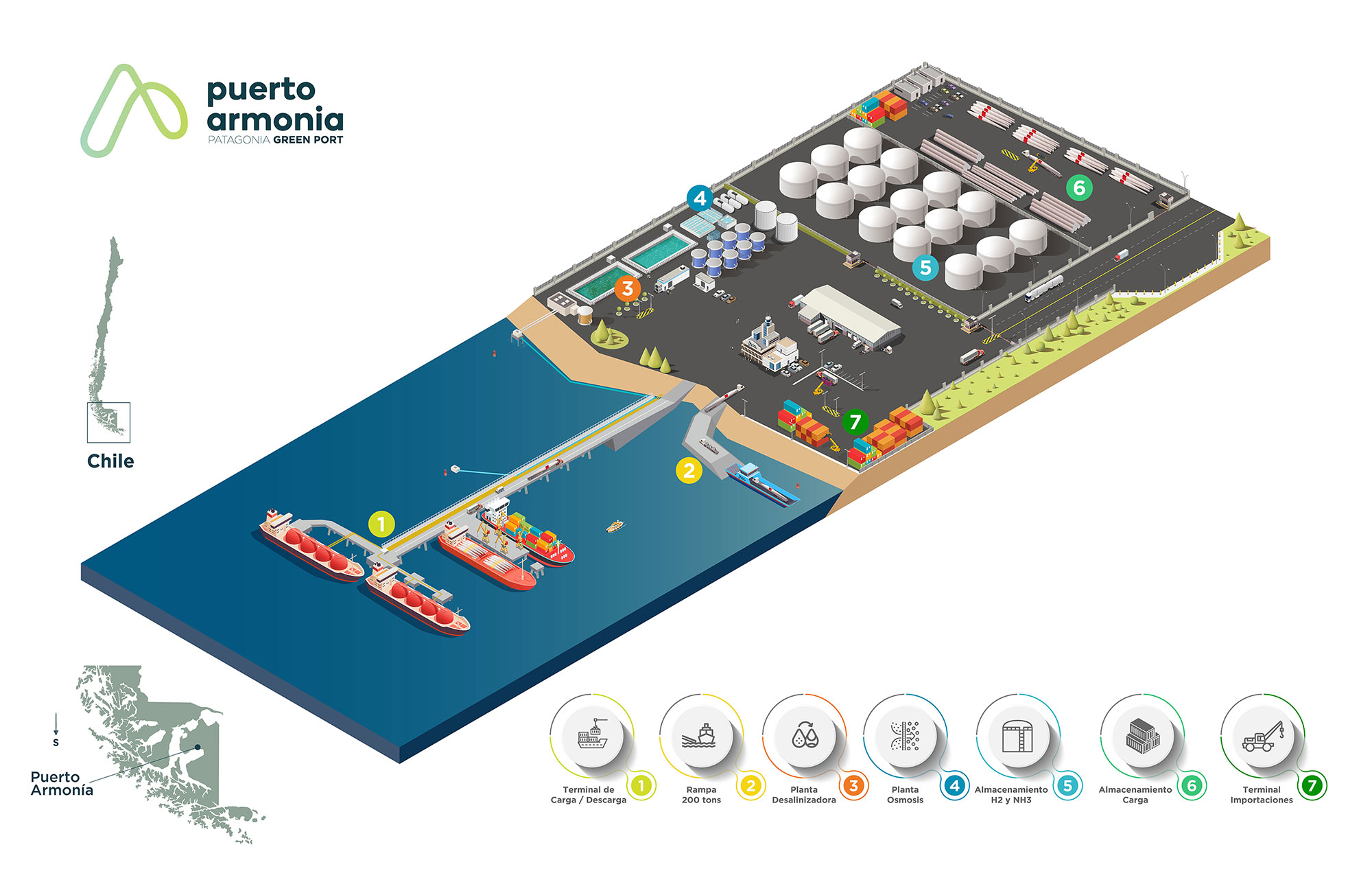 Es un proyecto portuario sustentable, concebido como un nodo logístico de escala internacional que integra producción, exportación y almacenamiento de hidrógeno verde (H₂V) y amoníaco verde (NH₃V)